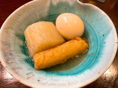 そこにおでんが登場しました!玉子、大根、ごぼう天!出汁のいい香りがしています~!いただいてみると、うん!もう最高!おでんはやっぱりお出汁が大事です!