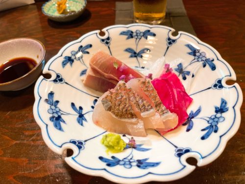 お刺身はヨコワの炙り、天然鯛!つけあわせのカブもめちゃいい色~!もう美味しいのは当たり前なのですが、鯛の皮がいい仕事してる!