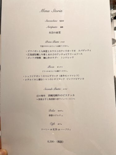テーブルに案内いただいてコース料理のご説明をいただきました。メニューをみていると、なんとあの幻の尾崎牛が!尾崎牛って食べたことがないのでかなり興奮しちゃいました!
