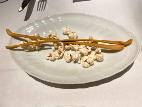 お酒と一緒に一皿登場しました。ポップコーンとグリッシーニ!ポップコーンが登場するのが面白いですね!私、ポップコーン大好物なのでめちゃうれしい~!お酒がすすみますよ~!