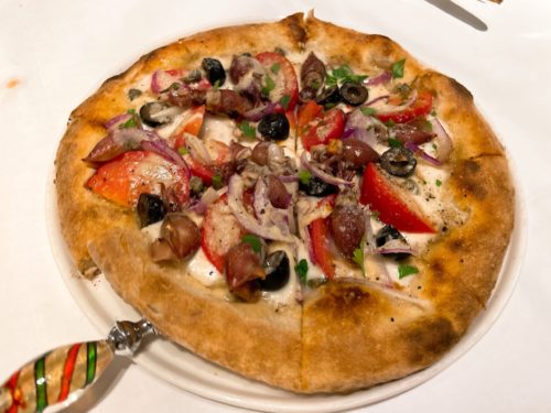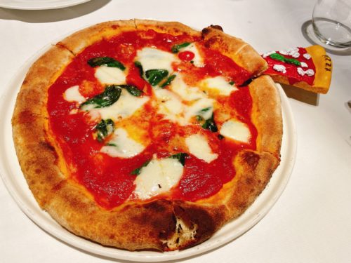 続いてピザが登場しました!お店にはピザ窯があるんです!自家製のマルゲリータ!とっても美味しそうなマルゲリータです!ピザカッターがとってもかわいいです!こんなカッターどこで手に入るんだろう。イタリアじゃないとなさそうですね!