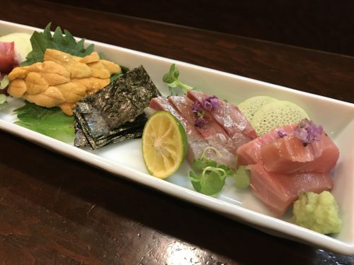 お刺身をお願いしました!マグロに生うに、そしてカンパチ!とってもおいしそう~!まずはカンパチから!めちゃくちゃおいしい~!マグロも生うにもめちゃくちゃおいしい~!さすがはえび一さん!