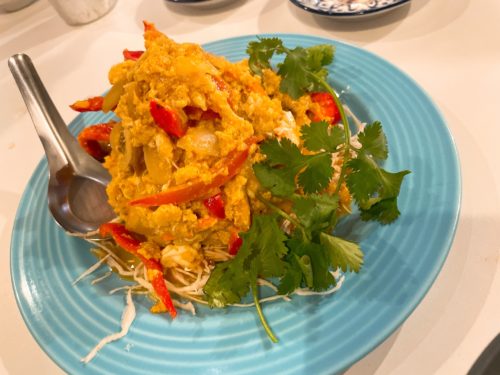 ジャスミンライスはしっかり残しておいて、最後にお願いしたのはプーパッポンカリー!よく蟹カレーと言われています。カリーといっていますが、そんなにカレーの風味を感じないのが特徴ですね。美味しそうなプーパッポンカリーが登場しました!