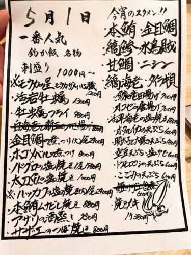 まずは生ビールで乾杯させていただいて、メニューを見てみます。釣とお店の名前にある通り、お魚が充実しています。