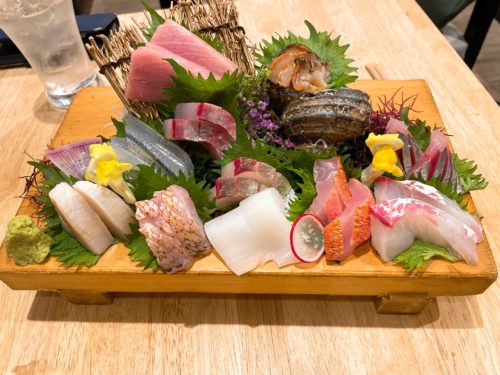 今度はお店のお刺身の盛り合わせを2人前で!一人前が1000円ですので、2000円分をお願いしたのですが、、登場したさし盛を見てびっくり!このボリュームで2000円でいいんですか?
