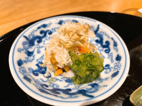 続いて蟹が登場しました!こちらは佐賀の花咲ガニのメスなんだそうです。添えてあったのはキプロス産のお塩!まずはそのままでいただいてみました。めちゃ美味しい~!身の下には子がたっぷり添えてありました。なんて美味しいんだ~!