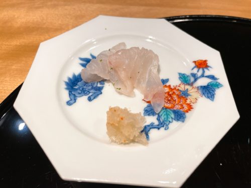 さて、先ほどご紹介いたしました鮨まつばらさんの続きです。はっすんまつばらという響きがどうしてもラッスンゴレライを彷彿とさせるのは私だけでしょうか?というしょうもうない冗談はさておいて、冗談ではない一品が!目の間にどどーんと、、、なんだろう?