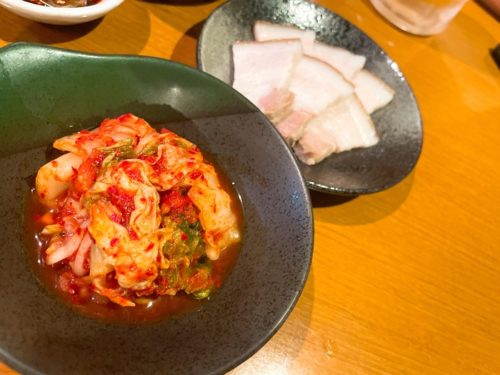 続いて豚肉とキムチが登場しました!豚肉でキムチを巻いていただきます。こちらも大好物!めっちゃめちゃ美味しいです~!豚肉の甘みとキムチの辛味、酸味が超あいます!
