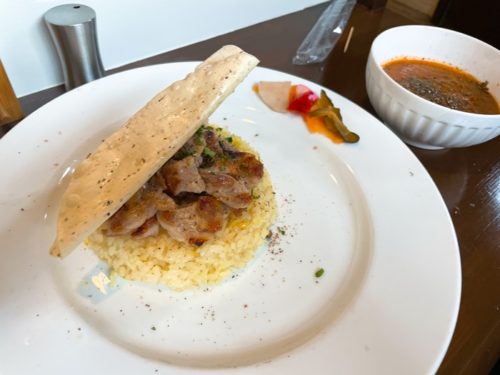 マスターの手際のよい動きから美味しいカレーがいただけるんだろうな~と伝わってきます。まずはチキンのトマトベースが登場しました!チキンもたっぷりのっています!おいしそうでしょう!