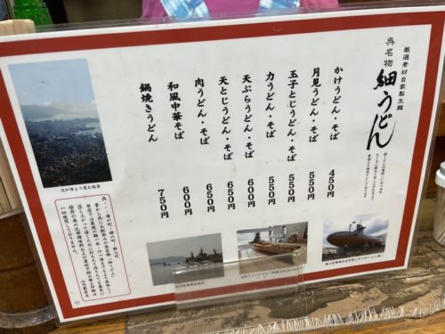 メニューをみながら、まずはかけうどんをお願いしました。呉といえばやっぱり細うどんです。呉は海の町で、海軍の町でした。美味しいものを素早く食べるため、細くなったと聞いています。早くゆであがって早く食べれます。汁も十分からみますからね~!