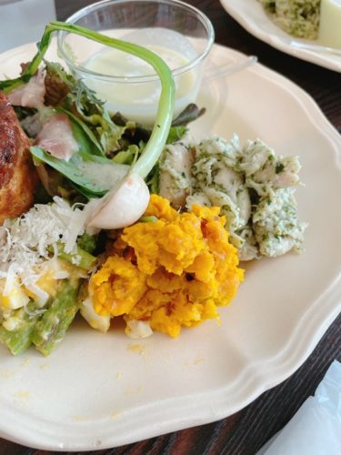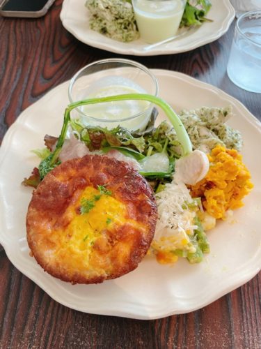 そこにまずはワンプレートでお食事が登場しました!とっても美味しそう!とうもろこしとキーマカレーのキッシュ、アスパラと半熟卵とパルミジャーノあえ、ささみコンフィ大葉ジェノベーゼ、かぼちゃとナッツのサラダ、枝豆のポタージュです。