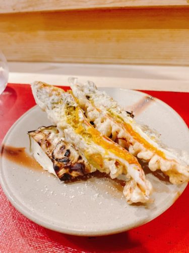 続いて登場したのがアナジャコの天ぷらです。マジャクとも呼ばれているそうです。焼いたかもナスの上にのってきました。