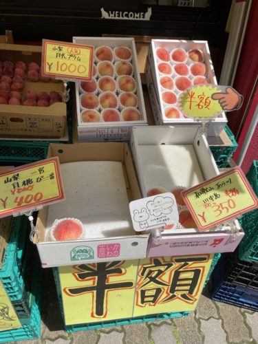 お店の前の桃スペースにはいろんな桃が並べられていました。本当に半額になっています。見た目も全然普通ですよ!傷んでいるんならわかりますが、まったくそんなことないです!すごいですね~!