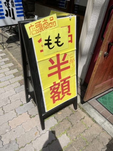 さて、先日ご紹介しましたフルーツショップてるやさんの前を再び通ってみるとこんな看板が!出た~~~!もも半額看板!ももが半額ってすごいですね~!前回訪れた際も半額でした!美味しい桃をリーズナブルにいろんな方に食べてほしいという思いの表れですね!