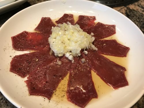 まずはユッケ!パックに入っているユッケではなくてちゃんと自社でさばいたユッケです!許可を持つのは相当難しいのですが、さすがはふるさとさん!一頭買いで自社設備が整っていらっしゃいますからね!とってもおいしい~!