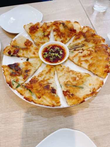 まずはチヂミが登場しました!大きなチヂミですね!タレにつけていただくと、サクッとして美味しい~!