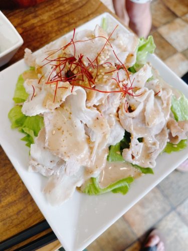 少しさっぱりするために豚しゃぶサラダをお願いしました!野菜たっぷりはいっています!ゴマダレとよくあいますよ~!