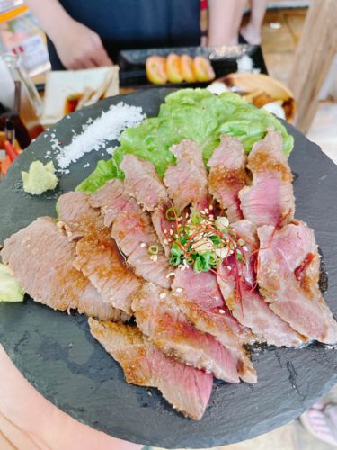 次にお店一押しのステーキをお願いしました!するとびっくりするほどのボリュームで登場!しかもレアに仕上げてくださっているのがいいですね!いただいてみると、美味しい~!焼き加減最高です!