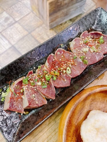 低温レバ刺しもお願いしました!レバ刺しなんてもう何年も食べていませんね。なきゃないで困りはしませんが、たまに思い出すと無性に食べたくなります。生肉をごま油と塩で食べることはありませんが、やっぱりレバーじゃなきゃ。とっても美味しそう!低温調理されているので生のように感じます。これがまたはちゃめちゃに美味しい~!お酒も進みます!
