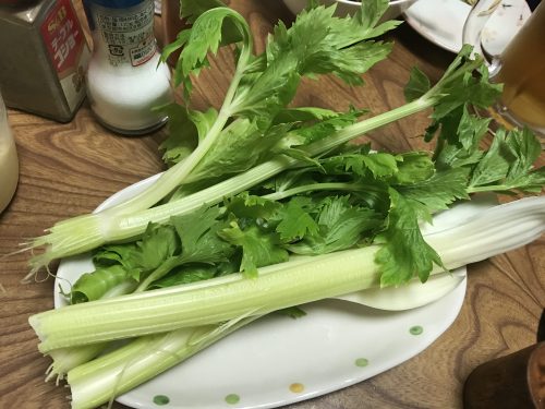 カウンターの上の立派なセロリもお願いしました~!セロリにマヨネーズをつけていただくととってもおいしんですよ~!お肉の脂もさらっととりさってくれるんです!