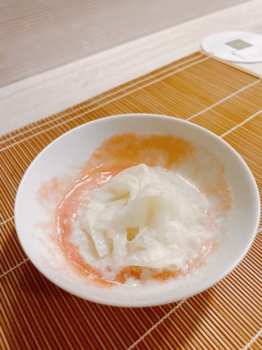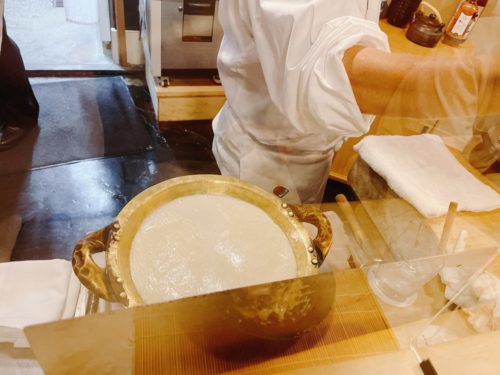 ここで先生がクエの切り身をもってきてくださって、鍋にはたっぷりの豆乳が!