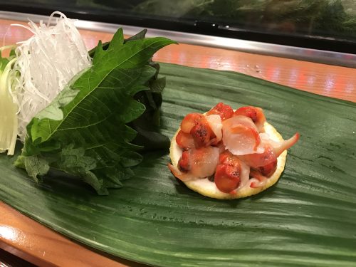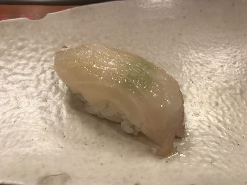 ここで軽く握ってもらいました~。いつもなら一人前をいただくのですが、この日は単品で少しにぎってもらいました~!まずは白身の鯛からいただきました~!塩でいただきます。おいしいですね~!淡泊なのに味わい深いんですよね~。何かの技が違うんでしょうね~。すごい!