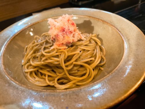 紅ずわいがにとカニミソのスパゲッティです!細麺なのでスパゲッティですね!紅ずわいがにもたっぷりのせてくださっています。麺にはカニミソがしっかりとなじんでいてめっちゃめちゃ美味しい~!すごい!