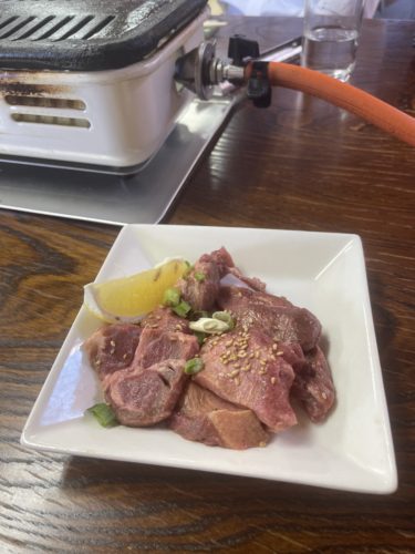 まずは牛タンをお願いしました!厚切りで大きなタンが登場しました!ガスで焼き上げていきます!レモンをたっぷり絞っていただきました~!