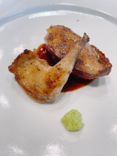 ここでもう一品お肉が!お肉といってもなんとフランスの鳩!しかも窒息鳩です!窒息させた鳩だとその血でソースを作ることができるって聞いたことがあります。感覚で言うと骨付き鶏肉を食べる感じでいただきます。ソースをたっぷりつけていただくと、、、美味しい。もう美味しいしかでてこない、、、一同黙りこくって食べまくりです!ほんとすごい!