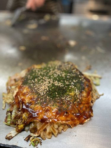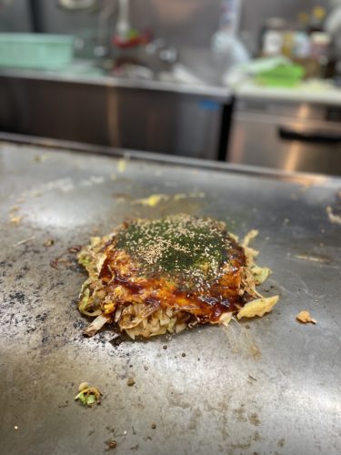 アツアツの鉄板の上でいい音を立てながらお好み焼きが焼きあがっていきます!