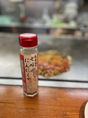 焼きあがったお好み焼きをヘラで切り分けていただく前に、この七味にんにくをたっぷりかけます。辛さはそこまでじゃなくて風味がとってもいいのでたくさんかけても問題ないです!