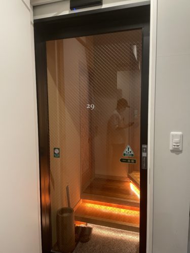 予約の名前を伝えて2階に案内してもらうと、スタッフルームとかかれた扉に、、あれ?なんと隠れ個室があるようです!自動ドアで入室しました!