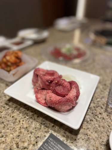 ここでようやく焼き始めます!まずは上タン塩から~!バラの花のように盛られています!トングで持った瞬間に美味しいのがわかります!柔らかくて超美味しい~!