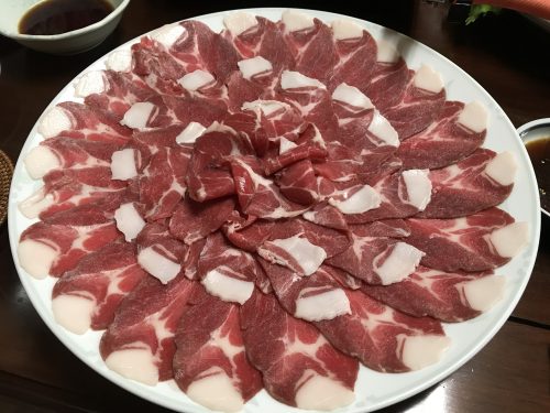つづいてイノシシのしゃぶしゃぶをいただきます!ものすごいおいしそうなお肉が!