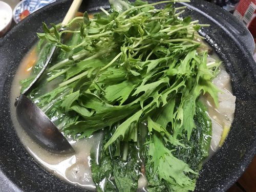 ここまでおいしくいただいたら終わりかと思ったら大間違い!やはりボタン鍋をいただかないと!野菜たっぷり入ったボタン鍋が登場しました~!