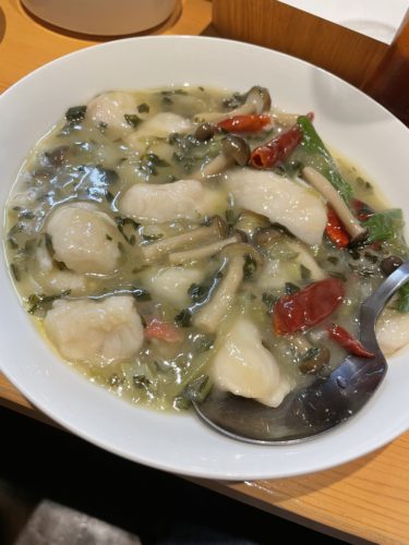 なんだかいい香りがするな~と思ったらキンメダイのサンラー煮込みが登場しました!サンラー煮込み大好きです!しかもキンメダイときましたよ~!酸味と少しのピリッとした辛さが食欲をよけいこそかり立ててくれます。キンメダイもたっぷり!