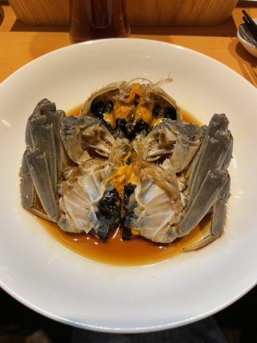 ついにこの日の一番のお楽しみにが登場しました!上海蟹!そして紹興酒で漬け込んであります!酔っ払い蟹っていうやつですね!しかもいいサイズの上海蟹ですよ~!生きてる上海蟹じゃないと紹興酒をしっかりすわないから美味しくないんですよね~!もう初めからしゃぶりつきます。めちゃくちゃ美味しい~!ミソと一緒にいただくとさらに美味しいですよ~!たまらんち会長です!