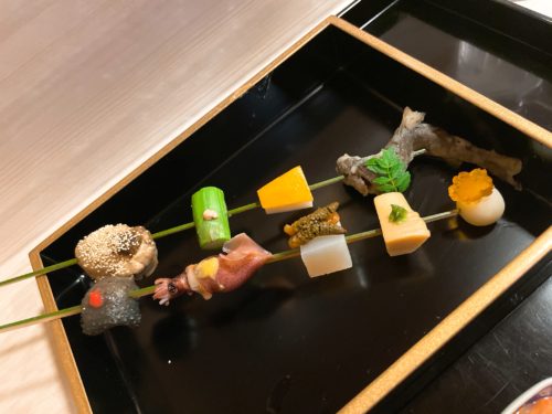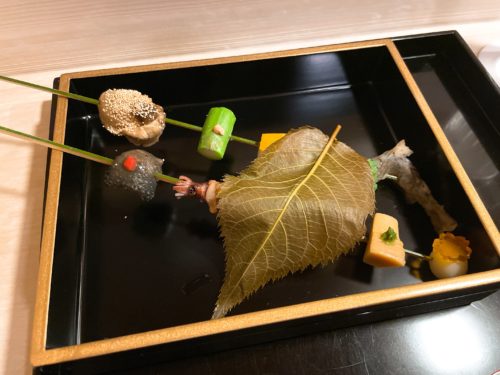 めくるとこの日は串にささった八寸でした!桜の葉もついています。とっても美味しそう!なまこなんてとっても柔らかくて美味しい~!稚鮎も入っていました!なんだか食べるのがもったいなく感じちゃいますね~!喜多丘さんは季節感をとても大切にしているので毎回とっても楽しむことができます。