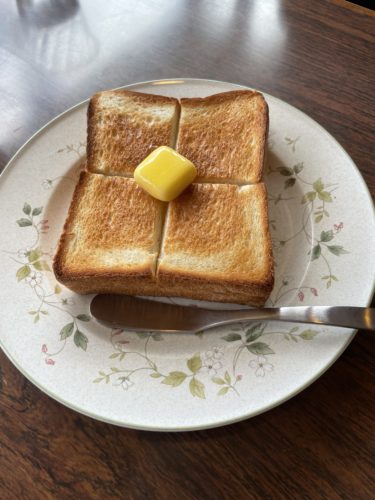まずはバタートースト!喫茶店のトーストってなぜか自宅で食べるよりも美味しいのはなぜですかね~。切れ目が入れてあってそこにバターがとけていく姿を見ているだけでよだれがでます。半分に分けていただくと、もっちもちで美味しい~!バターもたっぷり!最高です!