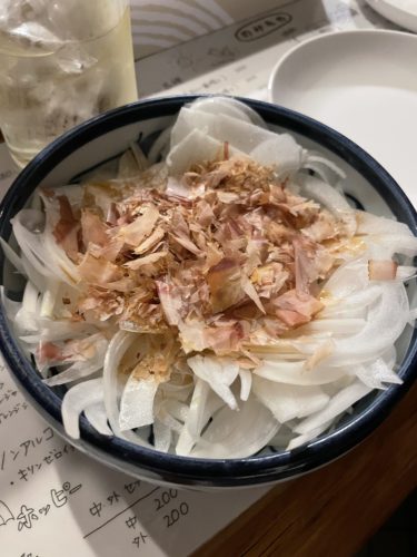 あてとして新玉ねぎのサラダをお願いしました!ビールに新玉ねぎもあいますね~!血液サラサラになってこれで心筋梗塞や脳梗塞の心配ともさようなら~!あっ、いたって健康ですので。笑