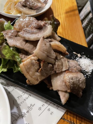 まさかのイノシシ肉がありました!立ち飲み屋さんにイノシシ肉が入っているとは想像していなかったのでみんな大興奮!みんなイノシシ大好きですからね~!脂身の上品な甘さがたまらないです!