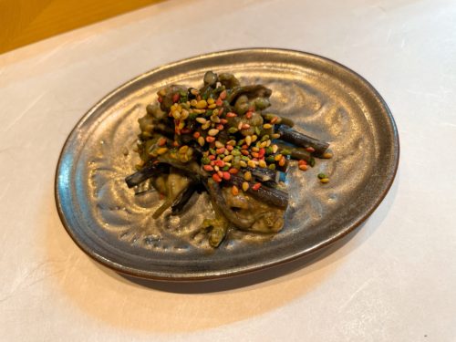 続いて広島産のわらびをいただきます。地物のわらびがいただけるって幸せなことですね~!色鮮やかなゴマもかわいいですね~!