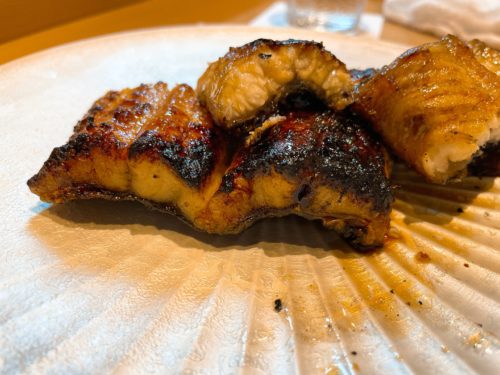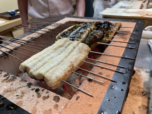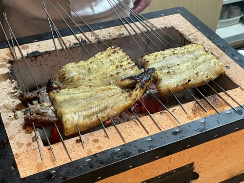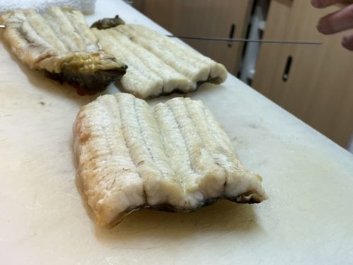 ここで天然のうなぎが登場しました!大きなうなぎですね~!キロ単位での価格が相当なので一人当たりの分量は少ないですが、期待が高まります。