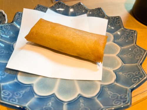 続いて気仙沼のフカヒレと黄ニラとしめじの手作り春巻きを!めっちゃ美味しい~!