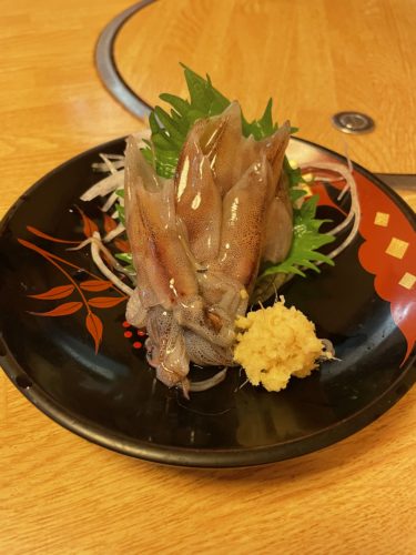 つづいて生ホタルイカをお刺身でいただきます。大きなホタルイカですね~!コリっとした食感がいいですね~!とっても美味しい~!