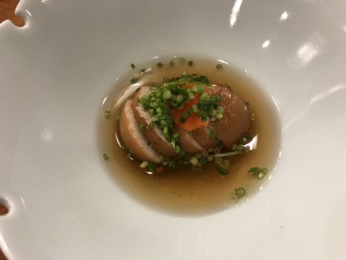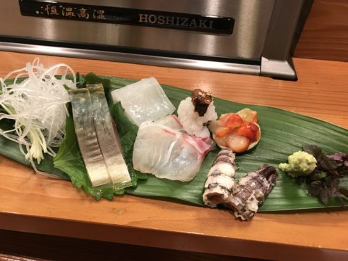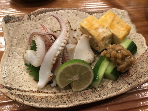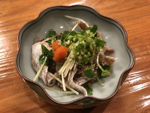 生ビールをいただきながら先付をいただきます。この日は何かな~と思っていたら鯛の皮でした!一口いただくと、、、おいしっ!むちゃくちゃおいしい!鯛の皮ってこんなにおいしかったっけな~、と思うくらいおいしいです!