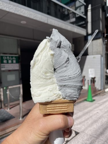店内もびっしりお客さんがいらっしゃいました!受け取って歩きながらいただきます。いい色していますね~!めっちゃめちゃ美味しい~!竹炭きなこも最高~!ピュアミルクもあっさりいただけてめっちゃめちゃ美味しい~!