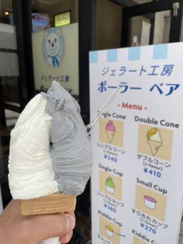 さて、とある快晴の日にフルーツを買いに行った際についでにいつものポーラーベアさんに訪れてきました。この日は2種類食べたかったのでダブルコーンでお願いしました。