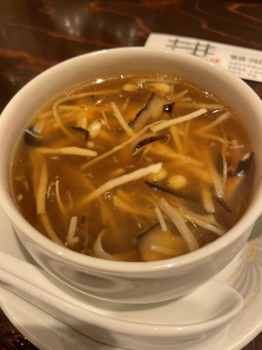 続いてフカヒレのスープをお願いしました!手際よくきむらさんが作ってくださる姿を見ているのも楽しみの一つです。そこに登場しました!いい香りがします!いただいてみると、フカヒレスープにはシイタケが大切ってことがわかります。しいたけのお出汁がよくでていて美味しい~!最高!フカヒレもたっぷり!