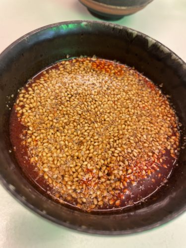 まずはつけダレが登場します!箸でかきまぜて味見をしてみます。うん、美味しい、、、辛っ!笑少し辛めですが私にとってはこれくらいじゃないと!